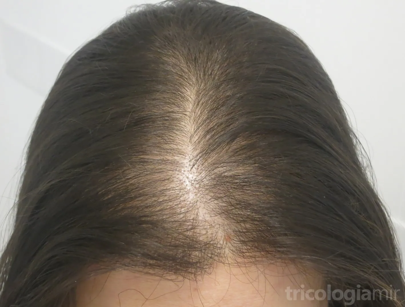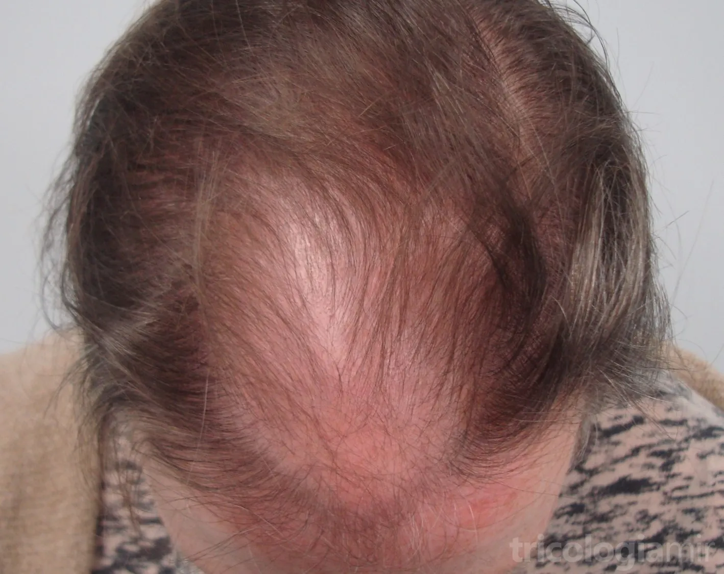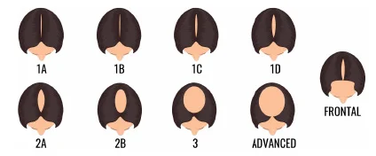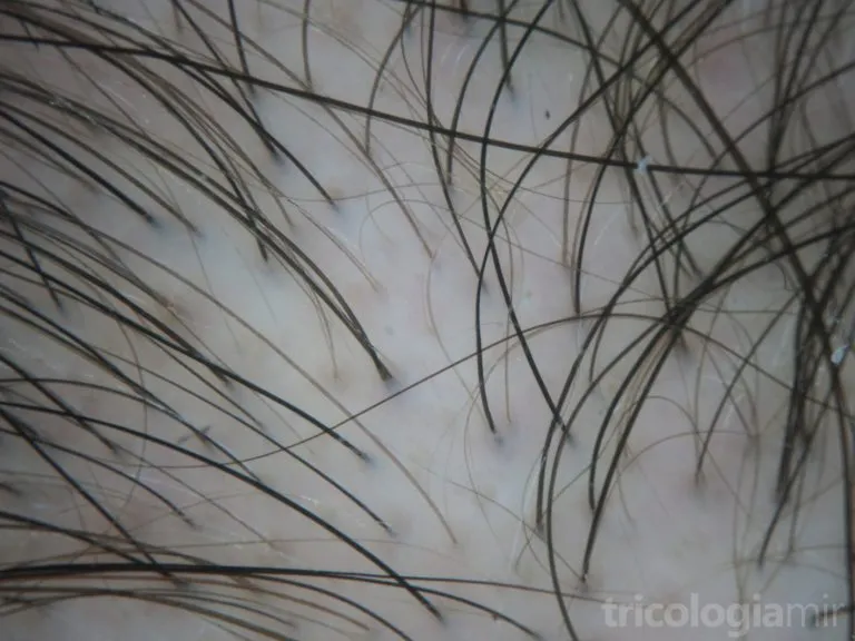La combinación de los factores anteriormente mencionados provoca un proceso de miniaturización del folículo piloso. El cabello se vuelve de manera progresiva más fino y corto. Esto conduce a una pérdida de densidad capilar que afecta de forma predomimante la región frontal central, produciéndose un “ensanchamiento” progresivo de la raya media del cabello, conservando la línea de implantación frontal. Con el tiempo puede haber una pérdida difusa a lo largo de toda la región superior del cuero cabelludo. Para valorar el grado de severidad disponemos de dos escalas: la de Ludwig y la de Olsen.