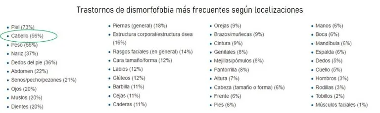 Aunque en ocasiones tendemos a banalizar dicha preocupación, la alopexia se considera en sí un trastorno dismorfofóbico. Eso significa que existe una percepción irreal e incluso delirante de la propia imagen corporal. No en vano, la piel y el cabello son las partes del cuerpo que más frecuentemente representan motivo de preocupación y/u obsesión, por delante incluso del peso. Además, puede asociar a su vez conductas obsesivo-compulsivas como las de comprobación o contaje. En los casos más graves también puede verse asociado o en el contexto de ansiedad, fobia social, depresión o traumas infantiles. En general, suele representar un perfil de paciente complejo, exigente, escéptico e insatisfecho con otros médicos y los tratamientos realizados. Aunque en general no suele ser necesario, en algunas ocasiones (principalmente si hay TOC asociado) está indicada la valoración psiquiátrica y la toma de psicofármacos, como inhibidores selectivos de recaptación de serotonina o antidepresivos tricíclicos.