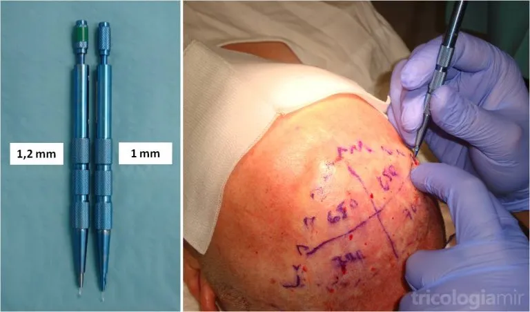 Los orificios de implantación los realizaremos mediante incisiones transversales con una lacenta Zaphiro de 1 mm o 1,2 mm, dependiendo del grosor de las UF y el número de pelos de cada UF. Es por eso, que realizaremos las incisiones más finas en las líneas delanteras, donde implantaremos las UF de 1 y 2 pelos. Sin embargo, en las zonas más posteriores podremos realizar las incisiones de 1,2 mm.