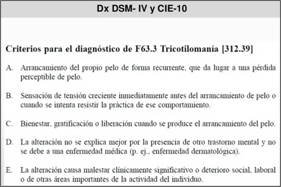La tricotilomanía se define como el hábito compulsivo de estirarse y arrancarse el pelo. De hecho, el DSM-IV lo considera un trastorno del control de impulsos y define unos criterios para su diagnóstico.