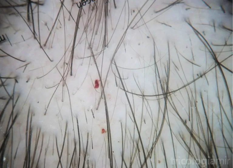 Se han descrito numerosos signos tricoscópicos asociados a la tricotilomania. Lo más característica es la presencia de pelos rotos a diferentes niveles y microhemorragia folicular sin signos inflamatorios. Estos hallazgos se pueden acompañar de vellos en crecimiento, pelos enroscados, puntos negros, pelos en V, tricoptilosis (puntas abiertas) y pelos en llama entre otros hallazgos.